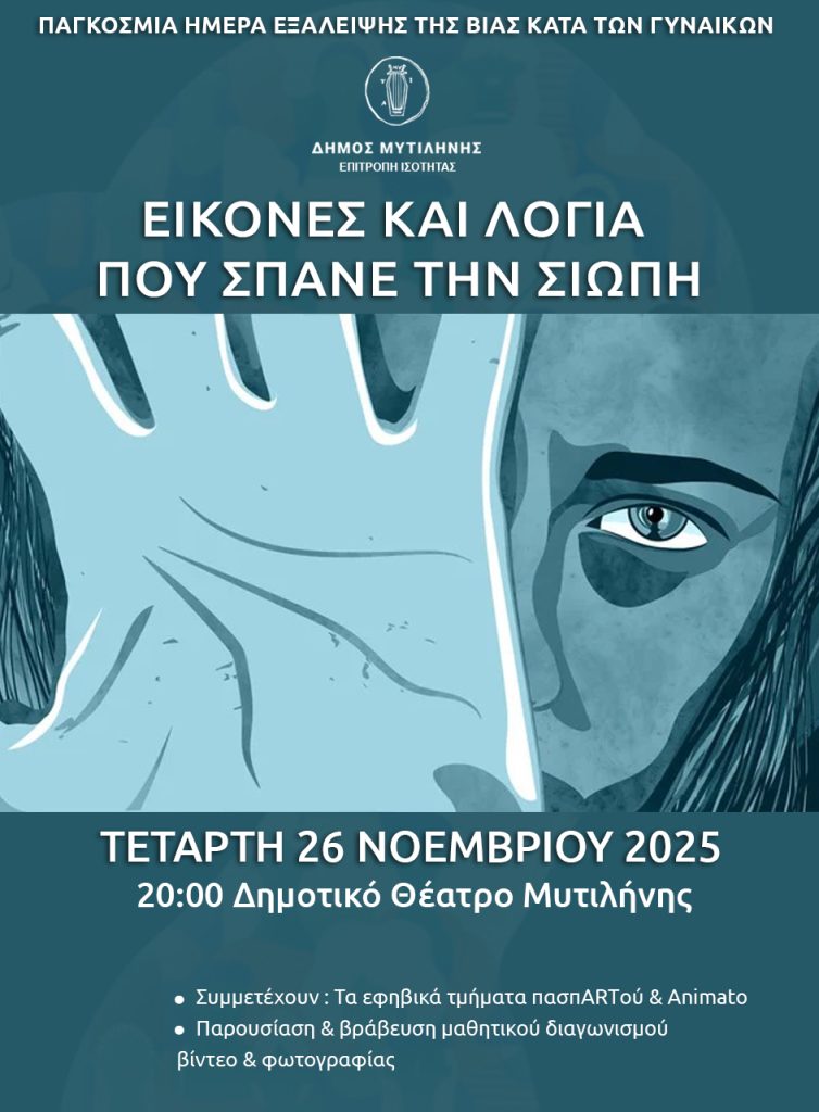 “Images and words that break the silence” is the title of the event organized on Wednesday, November 26, at 20:00 at the Municipal Theater by the Equality Committee of the Municipality of Mytilene, on the occasion of the International Day for the Elimination of Violence against Women, as part of the initiatives undertaken to highlight important social issues.