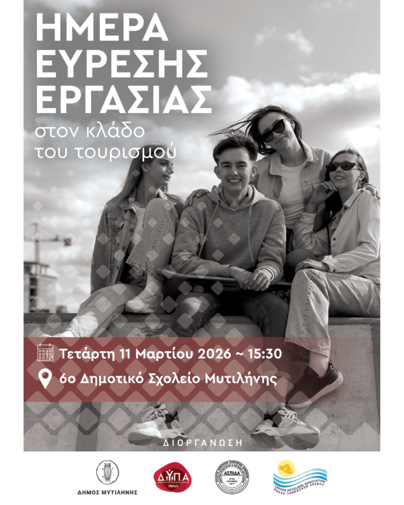 Η 3η Ημέρα Εύρεσης Εργασίας στον κλάδο του τουρισμού, μια σημαντική πρωτοβουλία που φέρνει σε άμεση επαφή επαγγελματίες, εργοδότες και υποψήφιους εργαζόμενους, διοργανώνεται την Τετάρτη, 11 Μαρτίου 2026 από τον Δήμο Μυτιλήνης, την Ένωση Ξενοδόχων Λέσβου, τον Σύλλογο Καταστημάτων Εστίασης και Ψυχαγωγίας «Ασπίδα» και την Πειραματική Επαγγελματική Σχολή της Δημόσιας Υπηρεσίας Απασχόλησης Ανέργων (Δ.ΥΠ.Α.). Η εκδήλωση θα πραγματοποιηθεί στις 15:30 το μεσημέρι, στο 6ο Δημοτικό Σχολείο Μυτιλήνης (είσοδος από την οδό Ναυμάχου Παπανικολή).