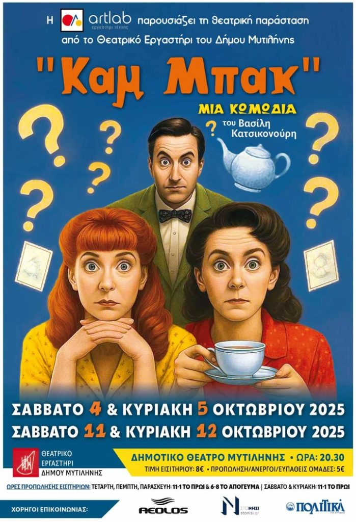 Η ΚΩΜΩΔΙΑ ” ΚΑΜ ΜΠΑΚ ” του ΒΑΣΙΛΗ ΚΑΤΣΙΚΟΝΟΥΡΗ από το ΘΕΑΤΡΙΚΟ ΕΡΓΑΣΤΗΡΙ ΔΗΜΟΥ ΜΥΤΙΛΗΝΗΣ στο ΔΗΜΟΤΙΚΟ ΘΕΑΤΡΟ ΜΥΤΙΛΗΝΗΣ για τα επόμενα 2 ΣΑΒΒΑΤΟΚΥΡΙΑΚΑ