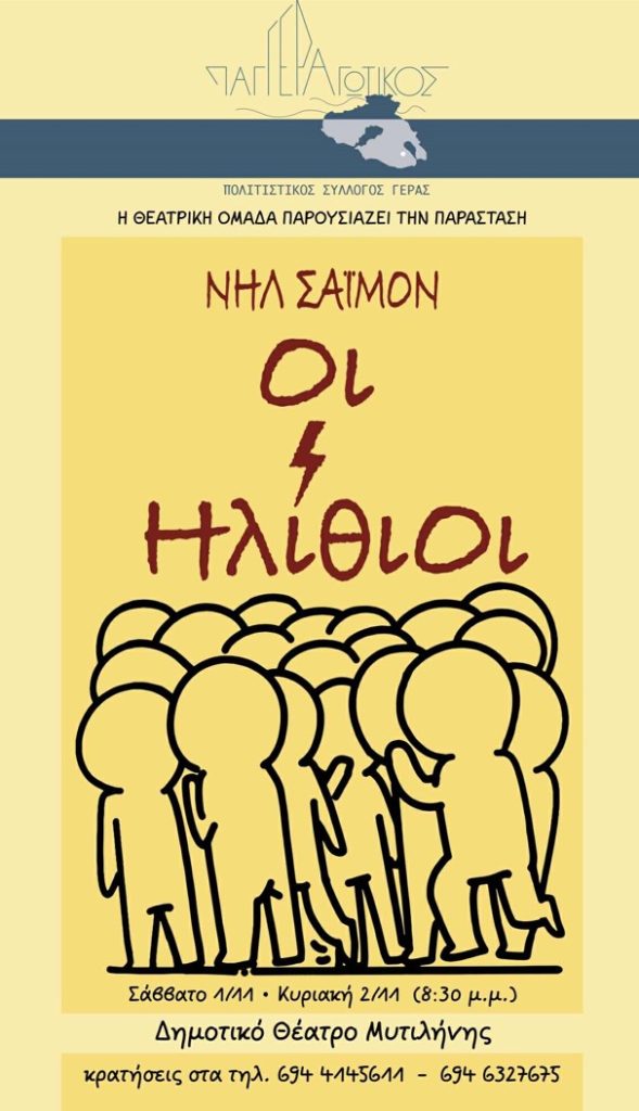 Την παράσταση «Οι Ηλίθιοι» του Νηλ Σάιμον, σε σκηνοθεσία του Θεοφάνη Τάκου, παρουσιάζει το Σάββατο 1 και την Κυριακή 2 Νοεμβρίου στις 8.30 μ.μ. στο Δημοτικό Θέατρο Μυτιλήνης, η Θεατρική Ομάδα του Παγγεραγωτικού.