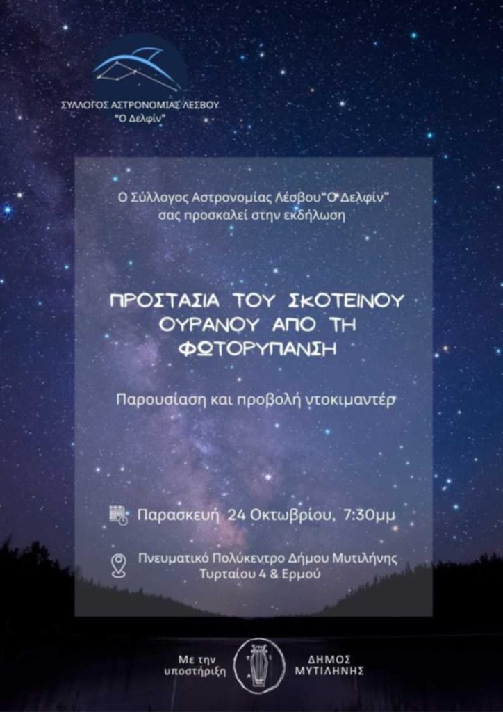 Ο Σύλλογος Αστρονομίας Λέσβου “Ο Δελφίν” σας προσκαλεί στην εκδήλωση “Προστασία του σκοτεινού ουρανού από τη φωτορύπανση”, την Παρασκευή 24 Οκτωβρίου 2025 και ώρα 7:30 μ.μ. στο Πνευματικό Πολύκεντρο του Δήμου Μυτιλήνης στην οδό Τυρταίου 4 & Ερμού.