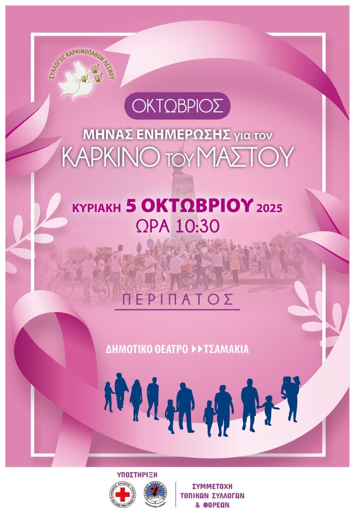 Ο Σύλλογος Καρκινοπαθών Λέσβου σας καλεί σε έναν συμβολικό περίπατο από το Δημοτικό Θέατρο Μυτιλήνης έως τα Τσαμάκια, την Κυριακή 5 Οκτωβρίου και ώρα 10:30πμ, στέλνοντας ένα μήνυμα ζωής, αγάπης και αλληλεγγύης.