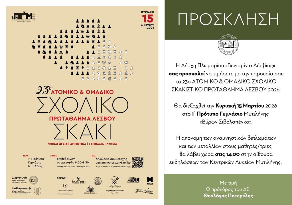 Η Λέσχη Πλωμαρίου “Βενιαμίν ο Λέσβιος” διοργανώνει το 23ο ατομικό και ομαδικό σχολικό σκακιστικό πρωτάθλημα Λέσβου 2026 με την οικονομική υποστήριξη του Δήμου Μυτιλήνης .
