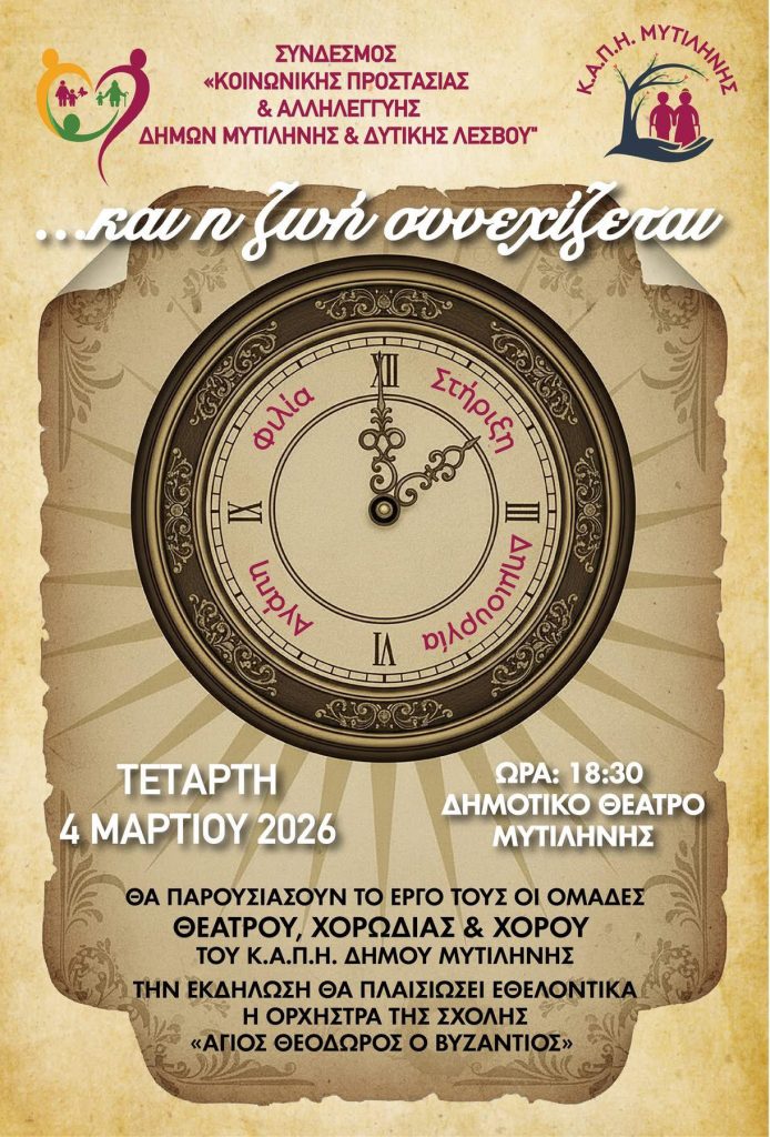 Μια όμορφη και ζεστή εκδήλωση που προετοιμάζουν εδώ και καιρό με αγάπη και ενθουσιασμό θα πραγματοποιηθεί την Τετάρτη, 4 Μαρτίου, στις 18:30 το απόγευμα, στο Δημοτικό Θέατρο της πόλης, από τα μέλη του ΚΑΠΗ Μυτιλήνης και το Σύνδεσμο Κοινωνικής Προστασίας και Αλληλεγγύης.