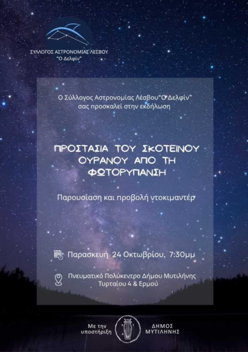 Ο Σύλλογος Αστρονομίας Λέσβου "Ο Δελφίν" σας προσκαλεί στην εκδήλωση "Προστασία του σκοτεινού ουρανού από τη φωτορύπανση", την Παρασκευή 24 Οκτωβρίου 2025 και ώρα 7:30 μ.μ. στο Πνευματικό Πολύκεντρο του Δήμου Μυτιλήνης στην οδό Τυρταίου 4 & Ερμού. Κατά τη διάρκεια της εκδήλωσης θα γίνει παρουσίαση και προβολή ντοκιμαντέρ.