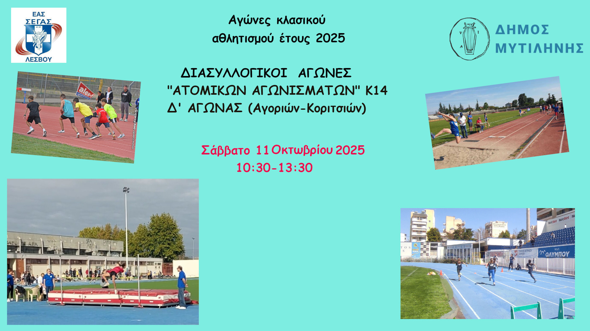 Οι Διασυλλογικοί αγώνες K14 Δ’ ΑΓΩΝΑΣ (Αγοριών-Κοριτσιών) που διοργανώνει η ΕΑΣ ΣΕΓΑΣ ΛΕΣΒΟΥ στο Δημοτικό Στάδιο Μυτιλήνης εντάσσονται στο αγωνιστικό καλεντάρι του έτους 2025. Σε αυτούς λαμβάνουν μέρος αθλητές και αθλήτριες απ’ όλα τα σωματεία που εντάσσονται στη δύναμή τους και ουσιαστικά αποτελούν το πρώτο αγωνιστικό τεστ νέων αθλητών για το τρέχον έτος.
