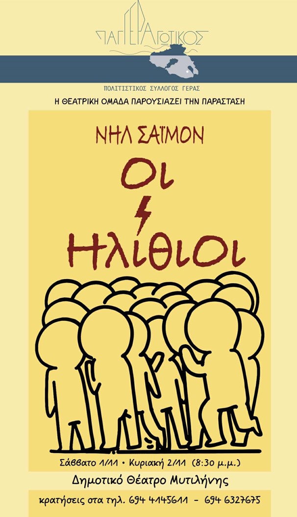 Την παράσταση «Οι Ηλίθιοι» του Νηλ Σάιμον, σε σκηνοθεσία του Θεοφάνη Τάκου, παρουσιάζει το Σάββατο 1 και την Κυριακή 2 Νοεμβρίου στις 8.30 μ.μ. στο Δημοτικό Θέατρο Μυτιλήνης, η Θεατρική Ομάδα του Παγγεραγωτικού. «Οι Ηλίθιοι» είναι μια ρομαντική κωμωδία του Αμερικανού θεατρικού συγγραφέα Νηλ Σάιμον, που διαδραματίζεται σε ένα χωριό της Ουκρανίας τον 19ο αιώνα. Η […]